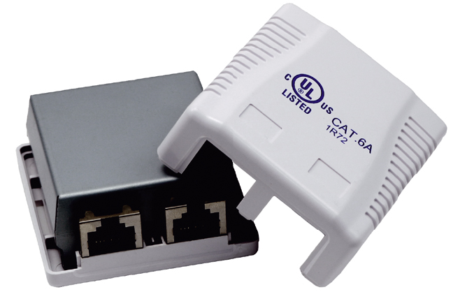 Розетка зовнішнього монтажу OK-net 6a FTP, 2 порт, призначена для використання зовнішнього монтажу та забезпечує високу швидкість передачі даних.