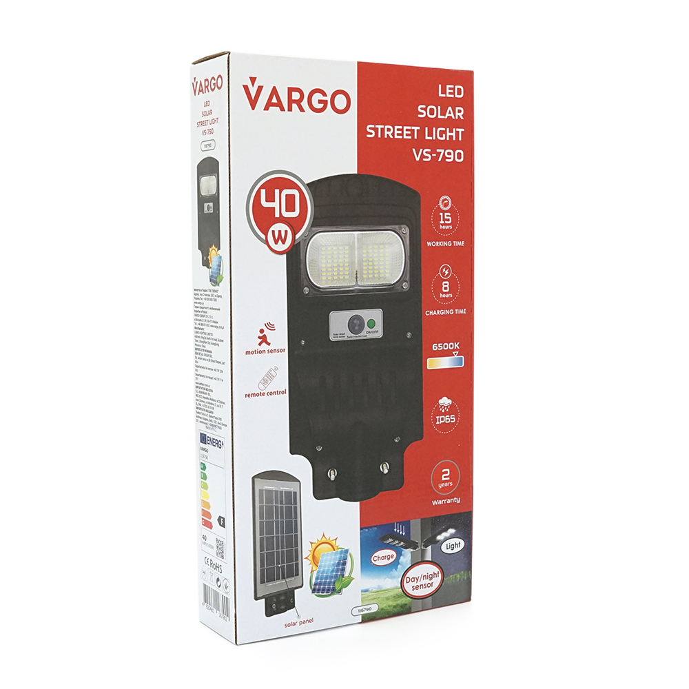 Вуличний ліхтар Vargo з сонячною батареєю на стовп 1VPP, 1 режим, корпус-міцний пластик, 40W, 6500K, 5400Lm, ip66, вбудований акумулятор, Black, Box